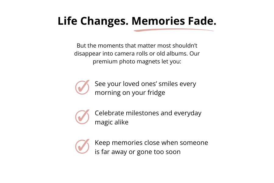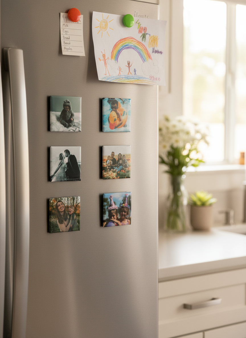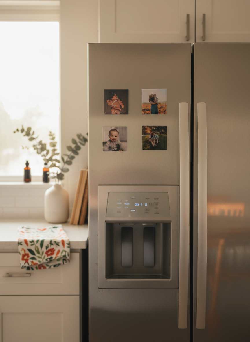 Why not just keep my photos on my phone? Phones break or get lost. Magnets keep your memories safe and visible every day — no scrolling needed.
